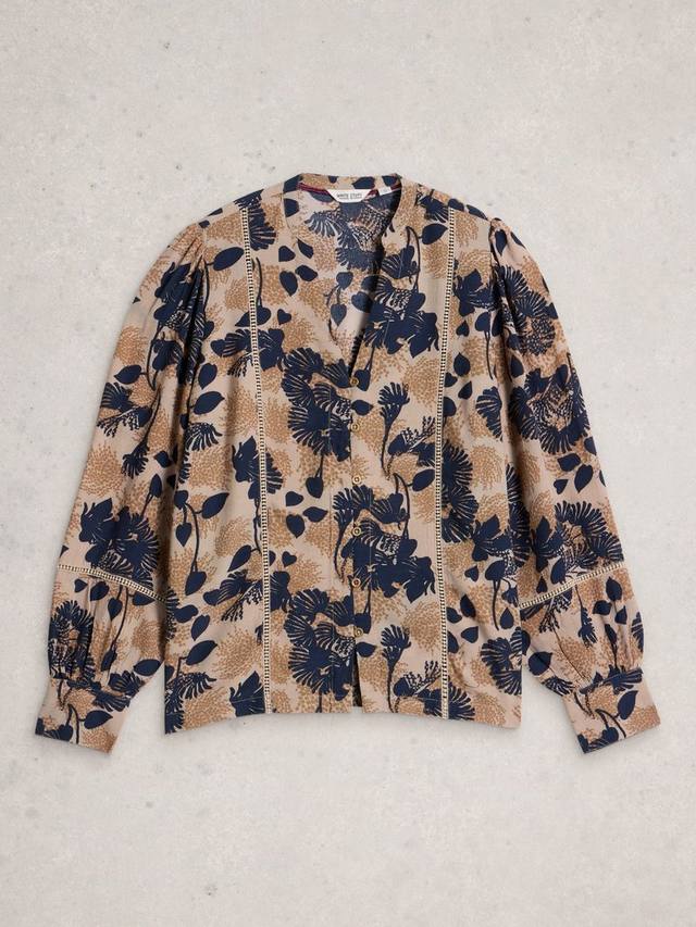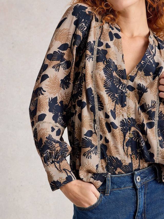 Топ с длинными рукавами, V-образным вырезом, застежкой на пуговицы и вышитой отделкой по подолу.