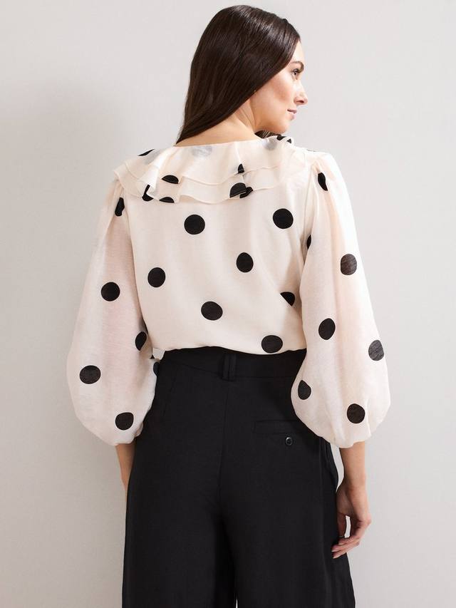 Добавьте в свой гардероб эту классическую модель в горошек. Эта блузка с элегантными оборками подчеркивает женственный V-образный вырез, а свободные рукава придают ей лёгкий объём. В сочетании с вашими любимыми элегантными брюками этот топ идеально подходит для вечерних выходов или особых случаев.