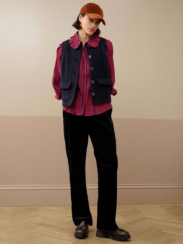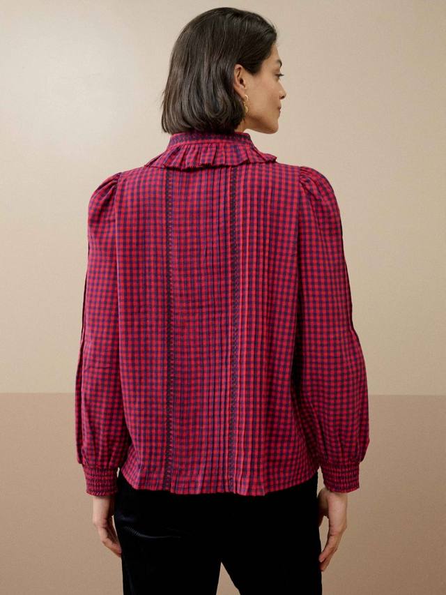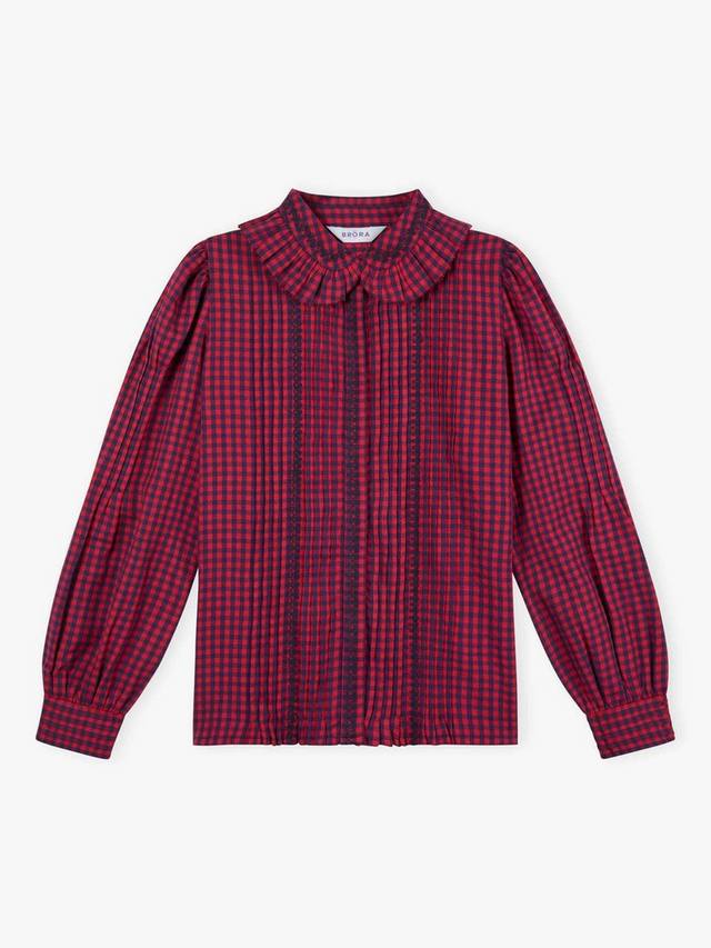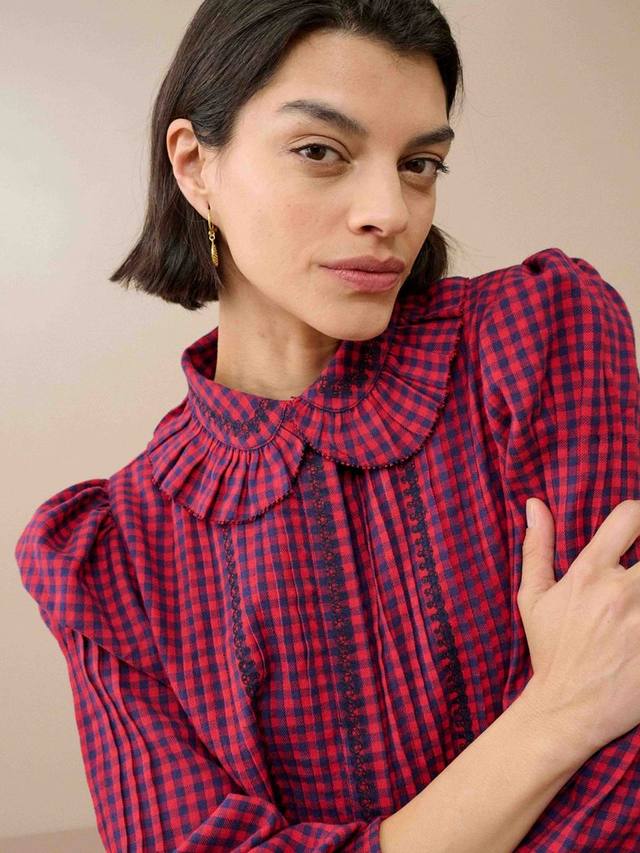 Для поклонников коллекции Brora в клетку гингем: это дополнение из чесаного хлопка наполнено продуманными деталями, которые вам обязательно понравятся, такими как эффектный воротник-жабо, вышивка в виде хвостика и изобилие защипов!
