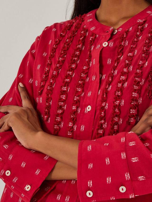 Эта блузка с геометрическим узором сочетает в себе дышащий комфорт и продуманную изюминку, делая ваш день лёгким и стильным. Длинные рукава и круглый вырез обеспечивают универсальность, а изящные детали располагают к разговору. Идеально подходит для того, чтобы добавить интереса и непринуждённости в ваш распорядок дня.