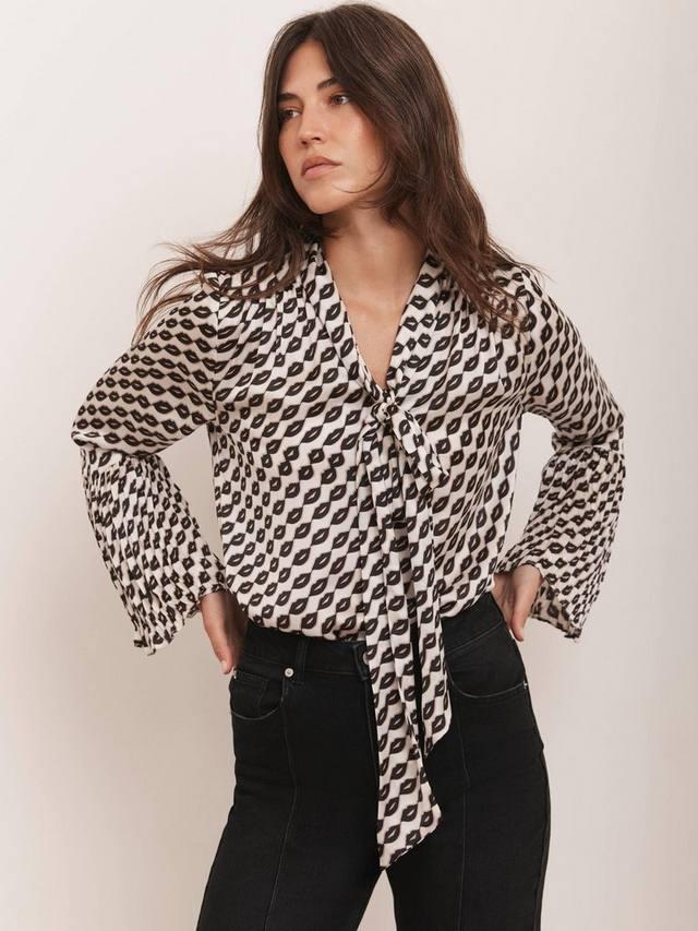 Блузка с принтом губ, вырезом бантом, длинными рукавами и гофрированными манжетами.