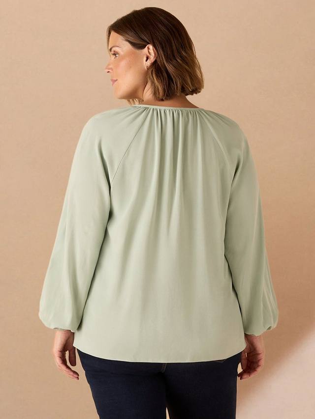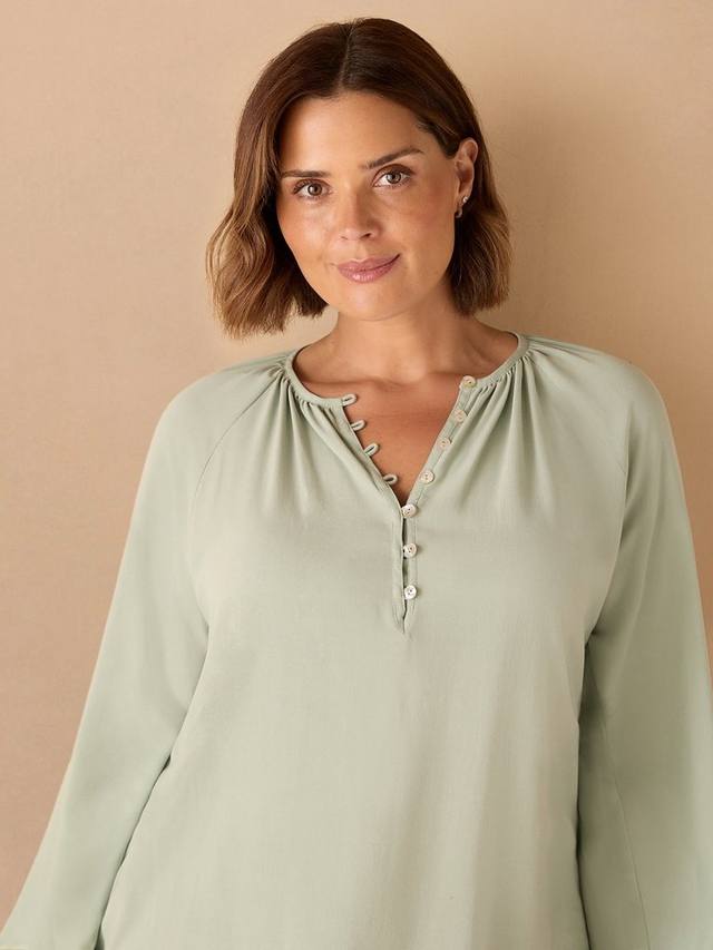 Блузка с рукавами реглан и застежкой на пуговицы спереди сочетает в себе мягкую структуру и непринужденное очарование. Благодаря струящемуся силуэту, изящным деталям на пуговицах и рукавам реглан, подчеркивающим фигуру, эта блузка станет вашим незаменимым помощником в создании элегантного повседневного стиля из сезона в сезон.