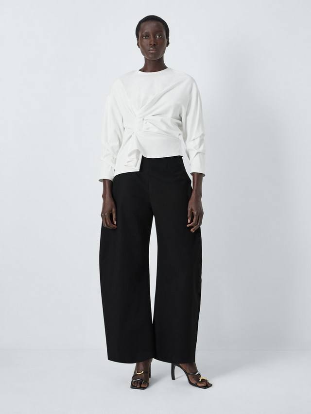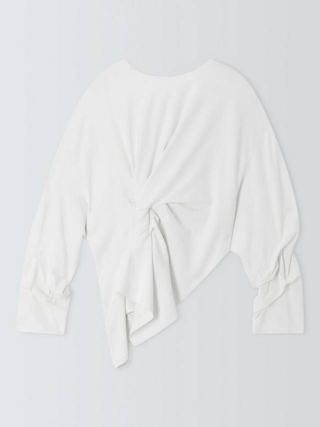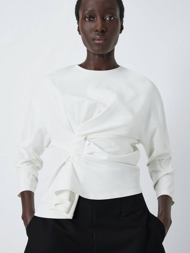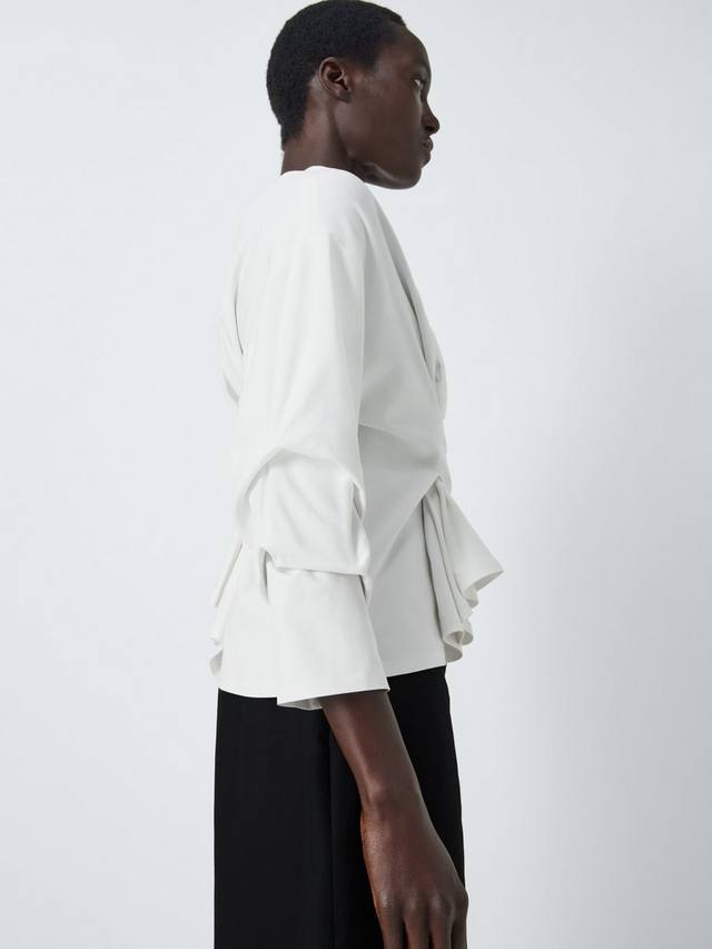 Блузка с узлом спереди и сзади. Ткань красиво драпируется, а рукава миди украшены сборками. Застегивается на молнию сзади на горловине.