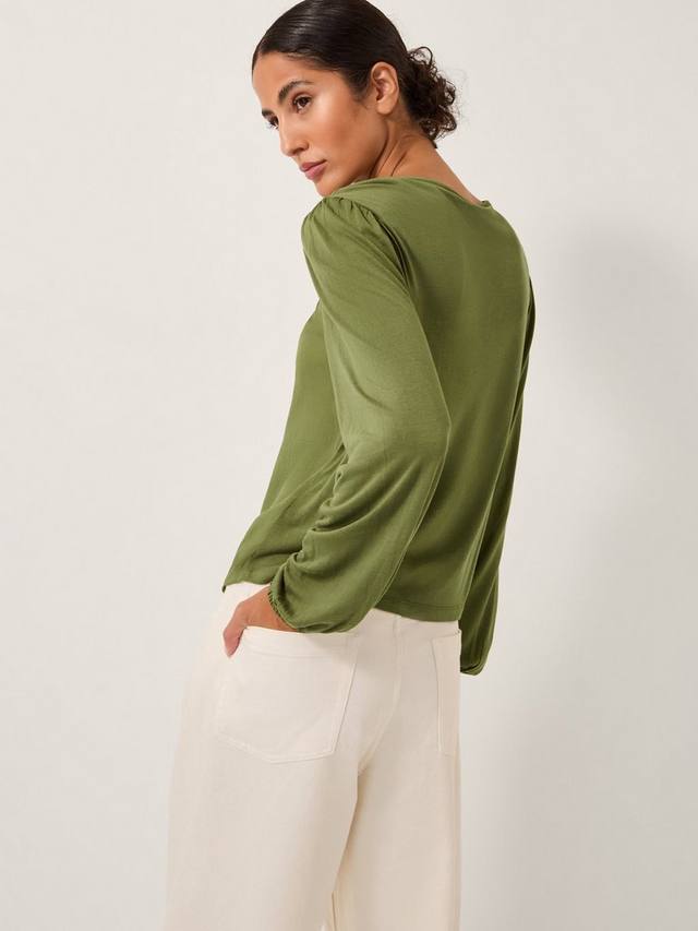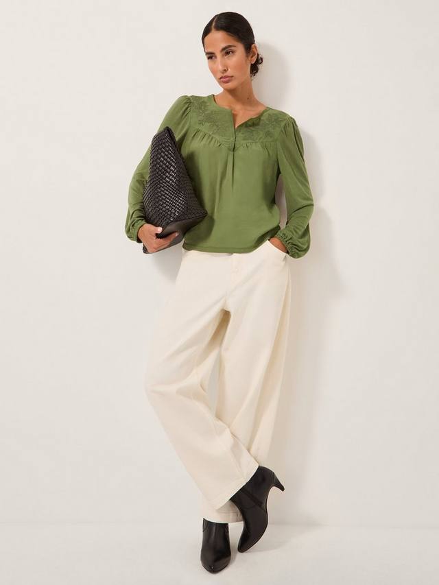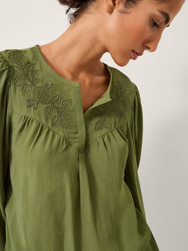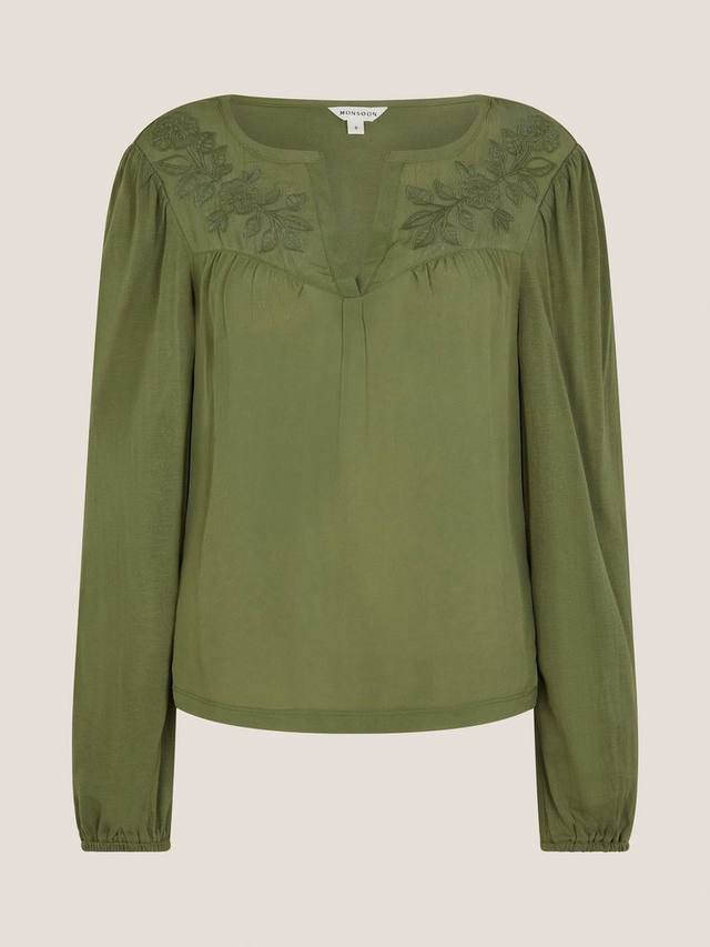 Эта блузка украшена цветочной вышивкой вокруг горловины, а рукава выполнены из мягкого трикотажного полотна для создания изысканного образа.