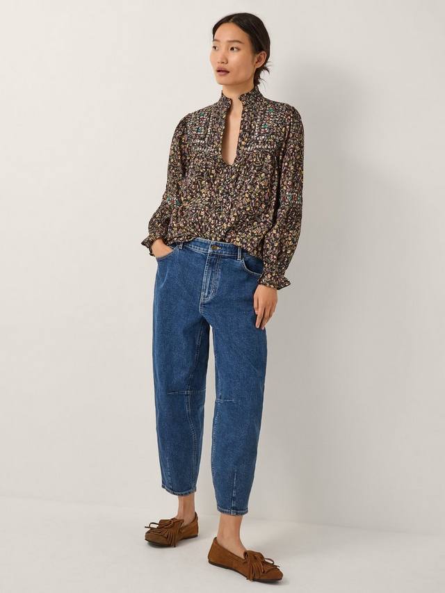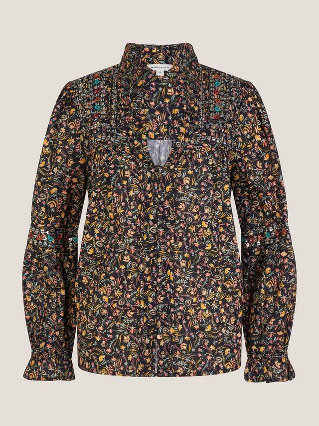 Эта блузка станет прекрасным дополнением к вашему гардеробу на все времена года. Она украшена яркими цветочными узорами и декоративными листьями, создающими изысканный образ. Она дополнена оборкой на горловине и манжетах в тон, а также расшита пайетками и бисером для создания изысканного бохо-образного образа.