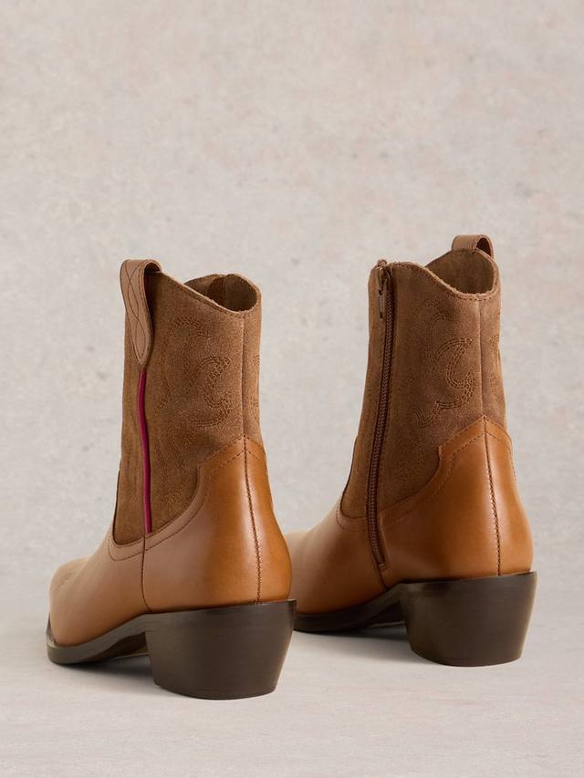 Пара ковбойских сапог из кожи с низким устойчивым каблуком и практичной застежкой-молнией. Острый носок и игривый вышитый узор добавляют нотку вестерна, сочетая комфорт с самобытным стилем для повседневных приключений.