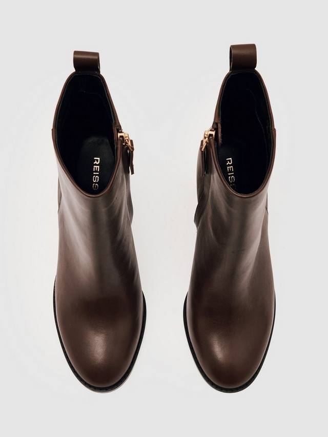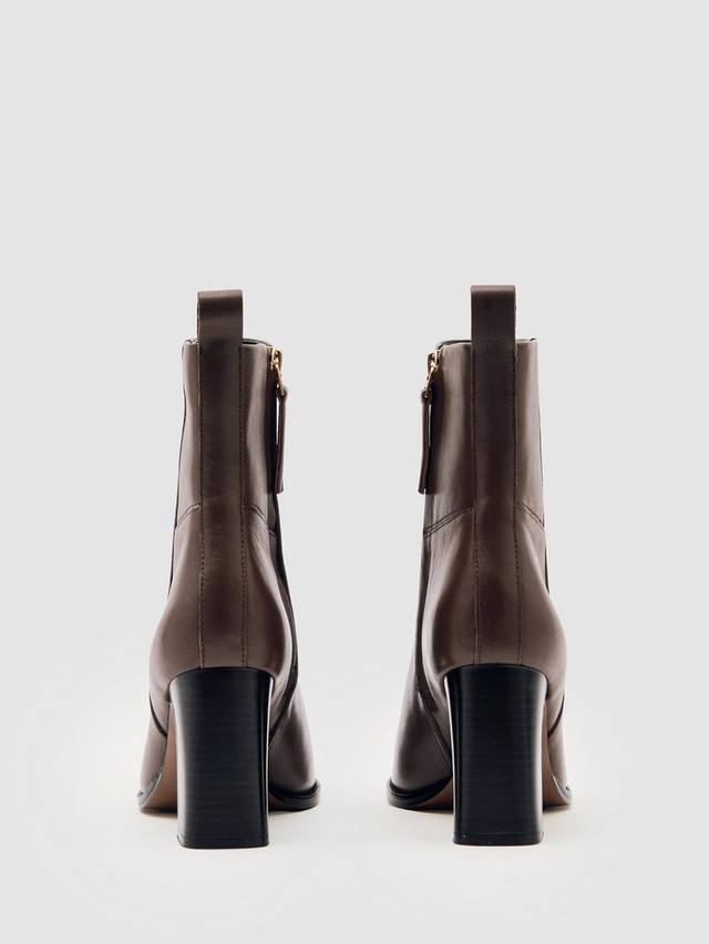Ботинки Reiss из телячьей кожи. Закрытый острый носок и высокий блочный каблук обеспечивают комфорт и удобство, а застежка-молния дарит вам лёгкость и удобство, куда бы вы ни пошли.