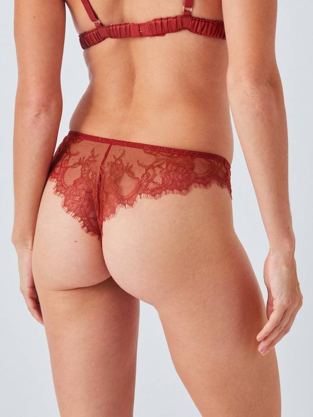 Трусики-бразилья с непрозрачной передней частью для скромности и кружевной спинкой.