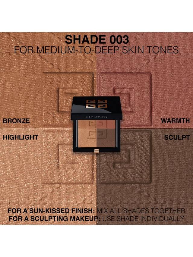 Экспертиза 4 цветов Givenchy Prisme Libre: сочетание 4 дополнительных цветов, смешанных в бронзирующую пудру, чтобы придать ей бронзовый, теплый, скульптурирующий и подсвечивающий оттенок для матового, выгоревшего на солнце эффекта, который мгновенно преображает цвет лица без какого-либо текстурного эффекта.