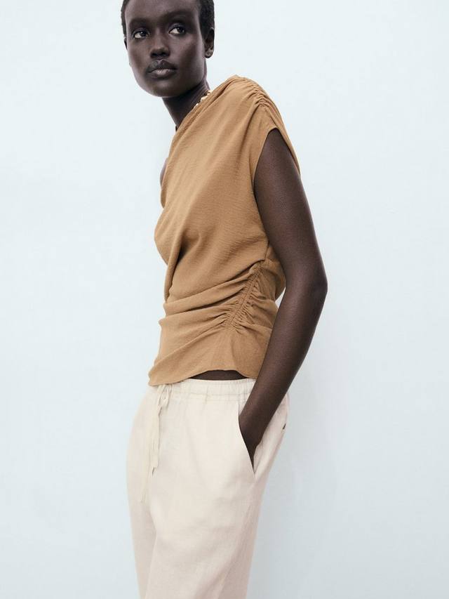 Зауженные брюки от Mango на льняной основе. Модель имеет среднюю посадку, талию на шнурке и низ до щиколотки.