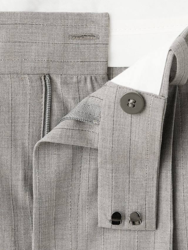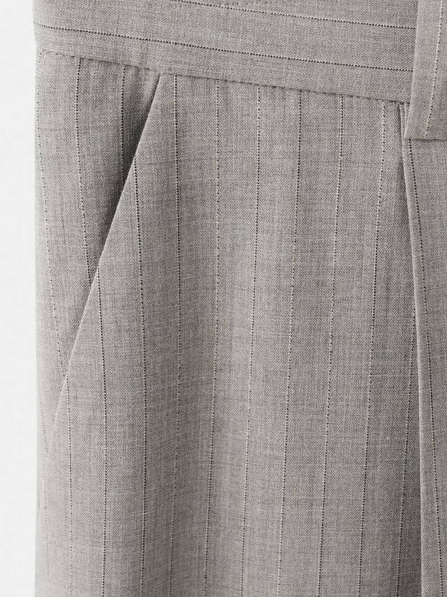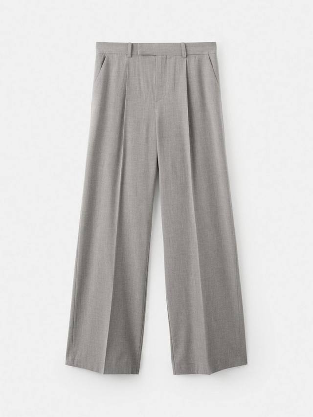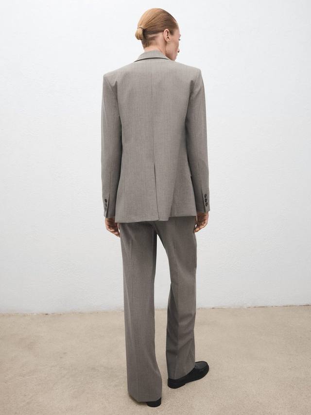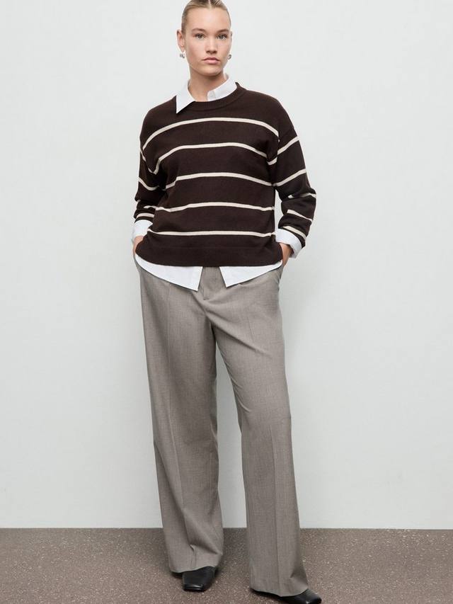 Сдержанный объём и строгий крой — широкие брюки в тонкую полоску от Mango. Они имеют среднюю посадку и застёжку-молнию.