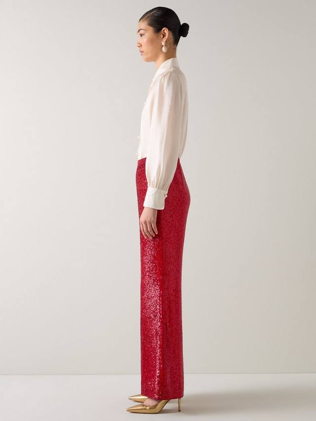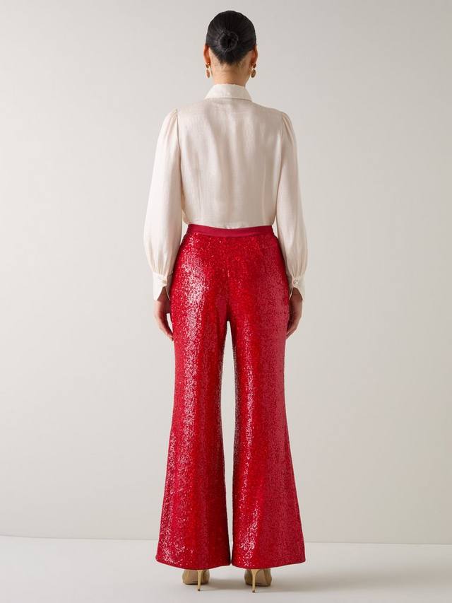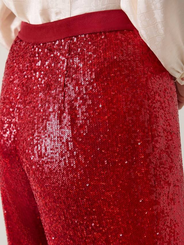 Эти брюки полной длины, расклешенные к низу, с пайетками, имеют широкий силуэт с расклешенными штанинами и идеальной эластичностью для комфорта движений. Эти брюки с высокой талией и мерцающим эффектом идеально подойдут для вечерних вечеров и особых случаев. Они добавят непринужденного гламура вашему гардеробу. Дополните их шелковой майкой и туфлями на каблуке с ремешками для гармоничного образа.