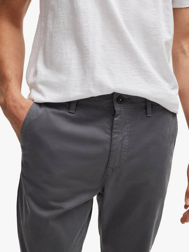 Брюки чинос модернизированного зауженного кроя из эластичной атласной ткани с насыщенным цветом и мягкой текстурой.