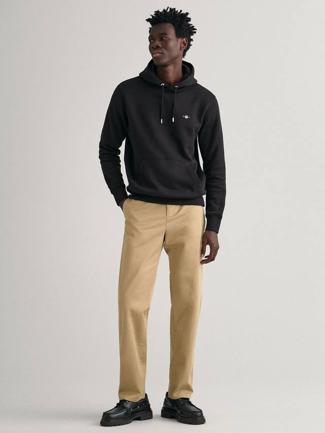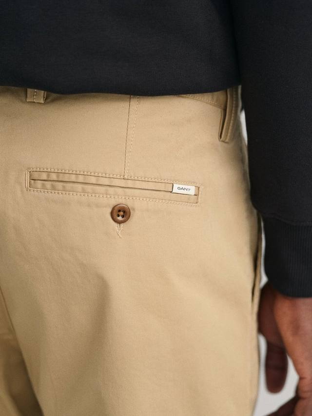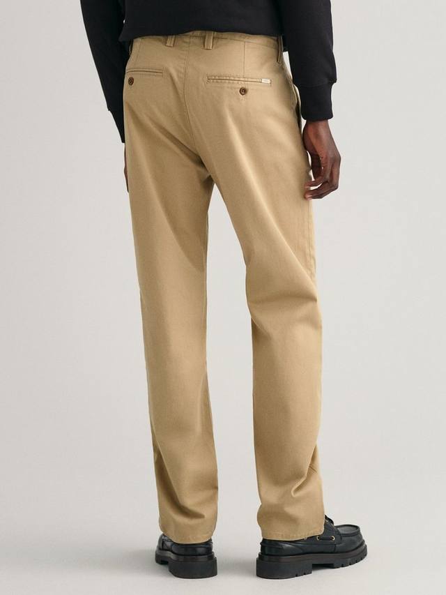Эти брюки-чинос из твила, ставшие культовой моделью GANT, – современный и универсальный предмет гардероба. Они изготовлены преимущественно из органического хлопка с добавлением эластичной ткани и имеют классический крой и среднюю посадку. Особенности: застежка на пуговицы спереди, двойные прорезные карманы сзади и пояс на подкладке из шамбре. Сочетайте с рубашками на пуговицах и блейзерами, а также с простой футболкой и кроссовками.