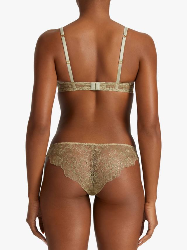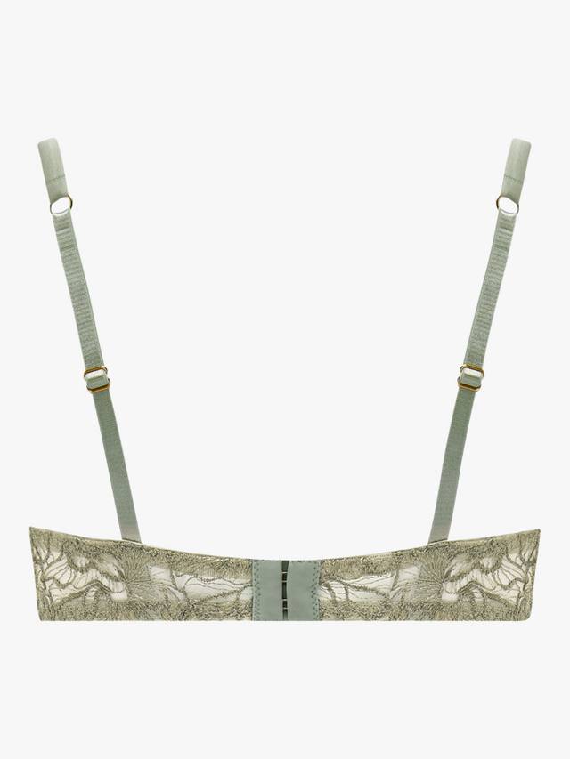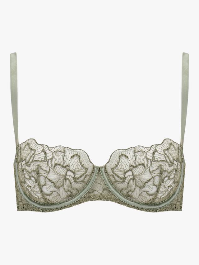 Эта вышивка, выполненная на заказ, украшена мозаикой из цветов, а роскошный шалфейный оттенок добавляет ещё больше изысканности. Косточки, обтянутые шёлком, придают мягкую структуру современному крою получашки, а фестончатый край игриво украшает зону декольте. Нежная вышивка обвивает пояс бюстгальтера, придавая ему структуру и изящество, а тихая роскошь изделия дополняется регулируемыми шелковыми бретельками, застежкой на крючок и изящной золотой фурнитурой.
