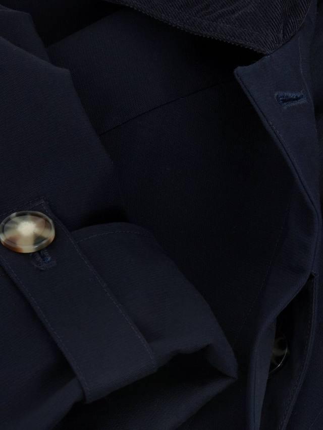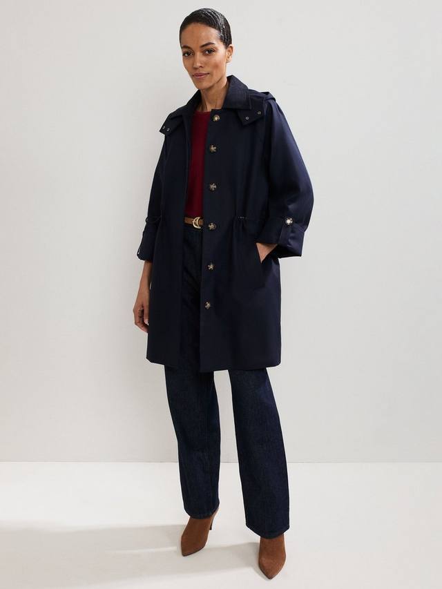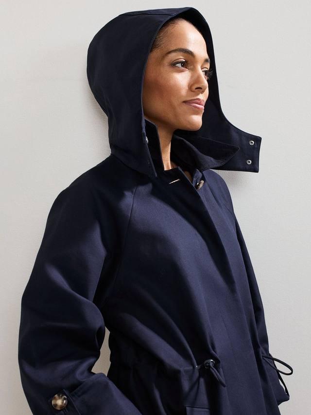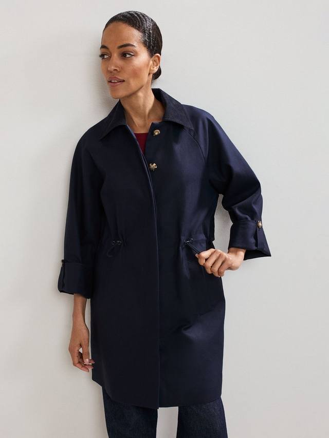 Элегантное и универсальное повседневное пальто. Изготовлено из водонепроницаемой ткани, имеет кулиску на талии и съёмный капюшон. Изысканные детали дизайна, такие как тонкий шнурок на воротнике и современные пуговицы в черепаховом панцире, создают изысканный и современный образ.