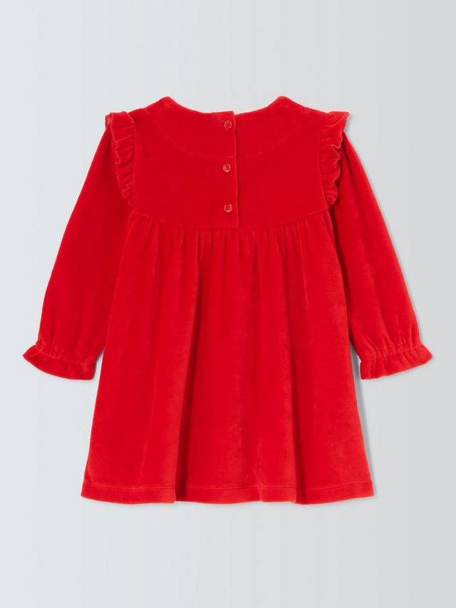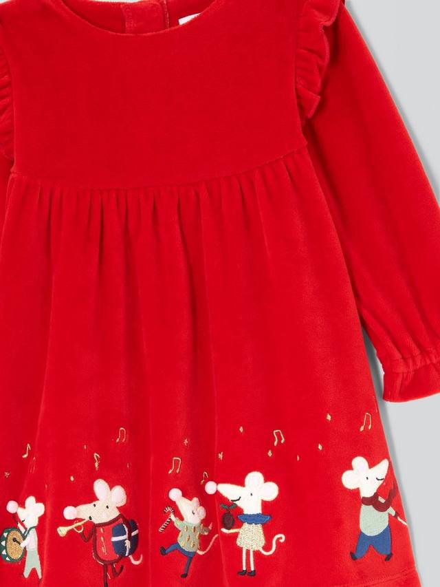 Велюровое платье с длинными рукавами и аппликацией в виде рождественской мышки по подолу. С оборками на плечах, эластичными манжетами на запястьях и пуговицами по центру спинки.