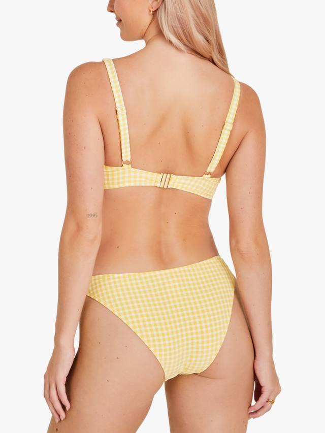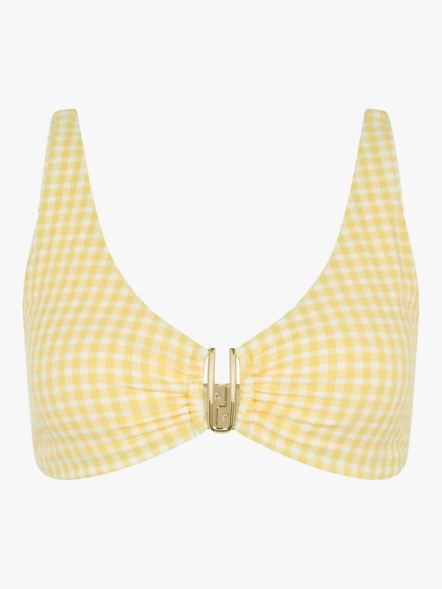 Этот бикини-топ в милую клетку виши с U-образной металлической фурнитурой по центру идеально подходит для бассейна. Застегивается сзади на застежку-липучку.