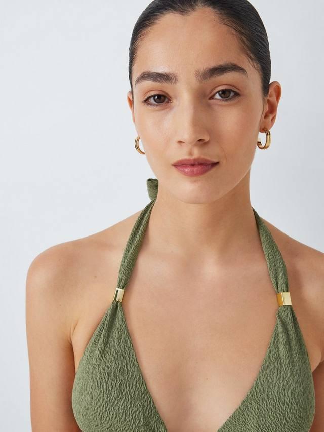 Наша парижская коллекция купальников отличается текстурированным дизайном. Этот треугольный бикини-топ с завязкой-халтером украшен золотистыми металлическими деталями. Дополните комплект плавками с завязками по бокам.