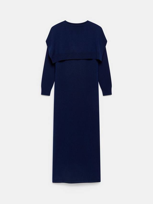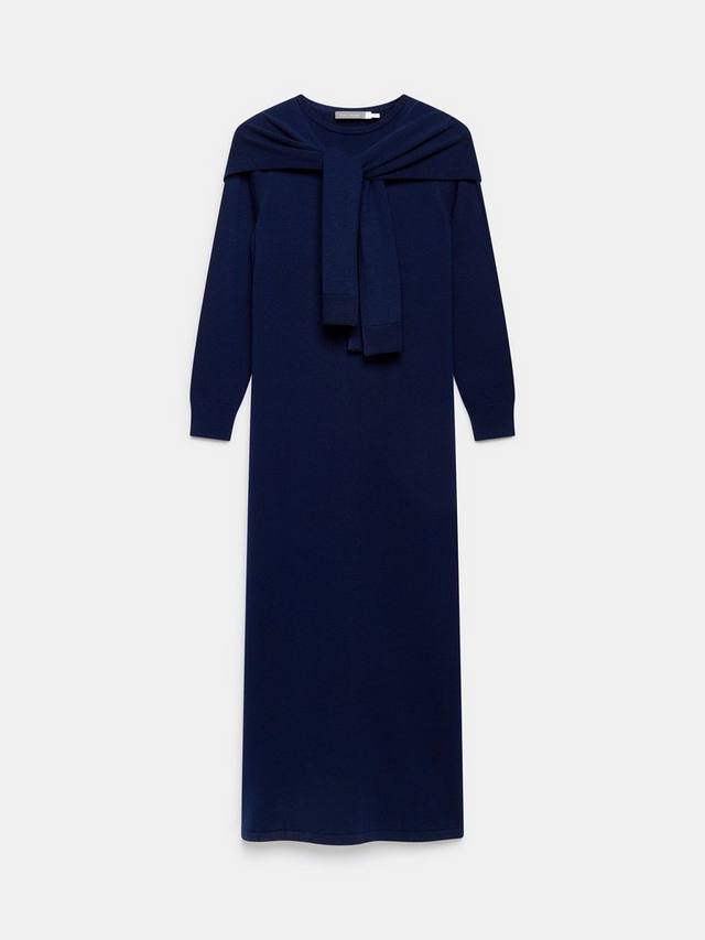 Трикотажное платье миди-силуэта с круглым вырезом, длинными рукавами и многослойным шарфом.