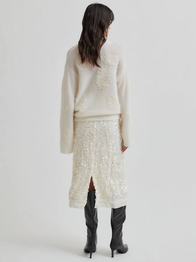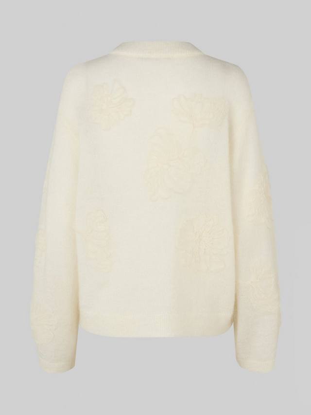 Свитер свободного кроя из мягкой и эластичной ткани с роскошными вкраплениями мохера и шерсти. 3D-цветы из сетки и удлиненные широкие рукава придают ему современный вид. Круглый вырез горловины, спущенные плечи, ребристые манжеты и низ изделия.