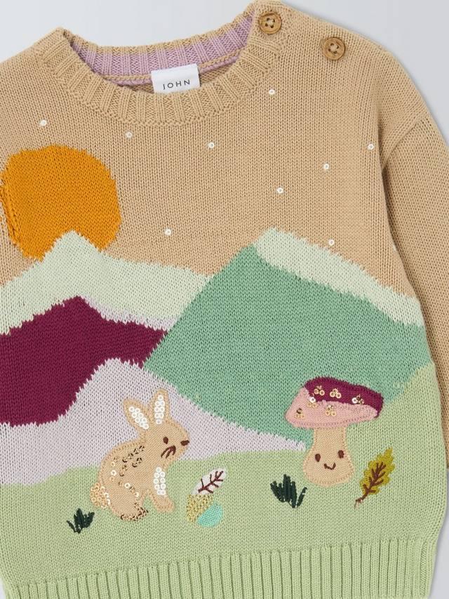 Этот джемпер, связанный из чистого хлопка, украшен очаровательным пейзажем с холмами, кроликом и грибом. Пуговицы-обманки на плечах облегчают надевание.