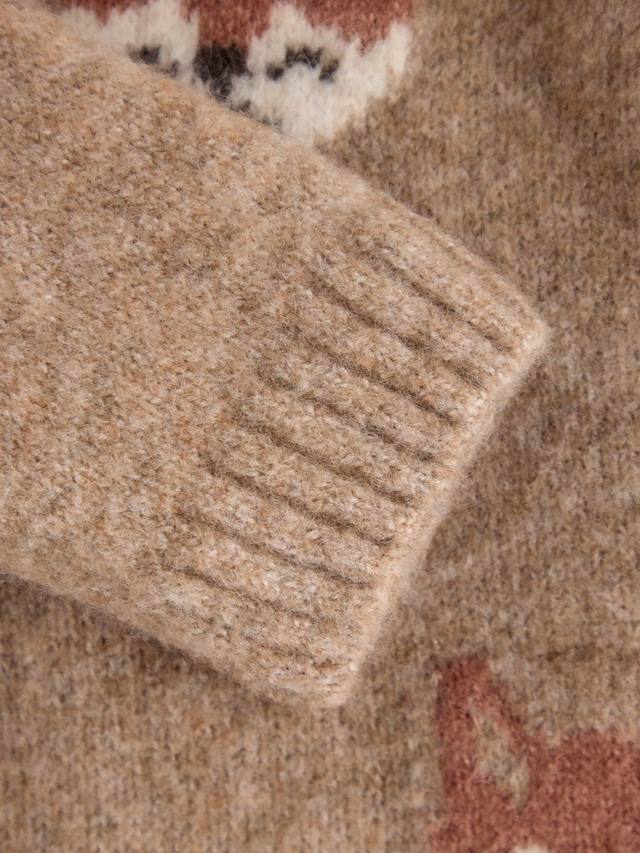Этот уютный бежевый меланжевый джемпер с очаровательным рисунком в виде лисы по всей поверхности идеально согреет и сделает ваш зимний образ стильным и теплым.