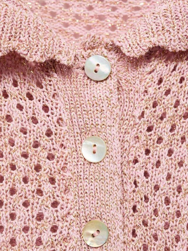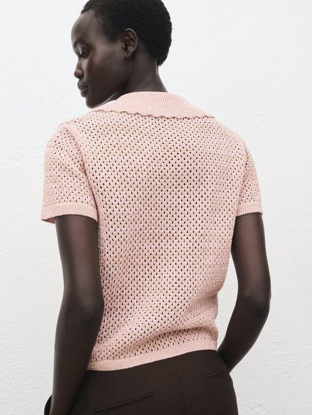 Этот трикотажный топ от Mango с воротником-стойкой и короткими рукавами выполнен из супермягкой хлопковой смеси и украшен ажурной отделкой.
