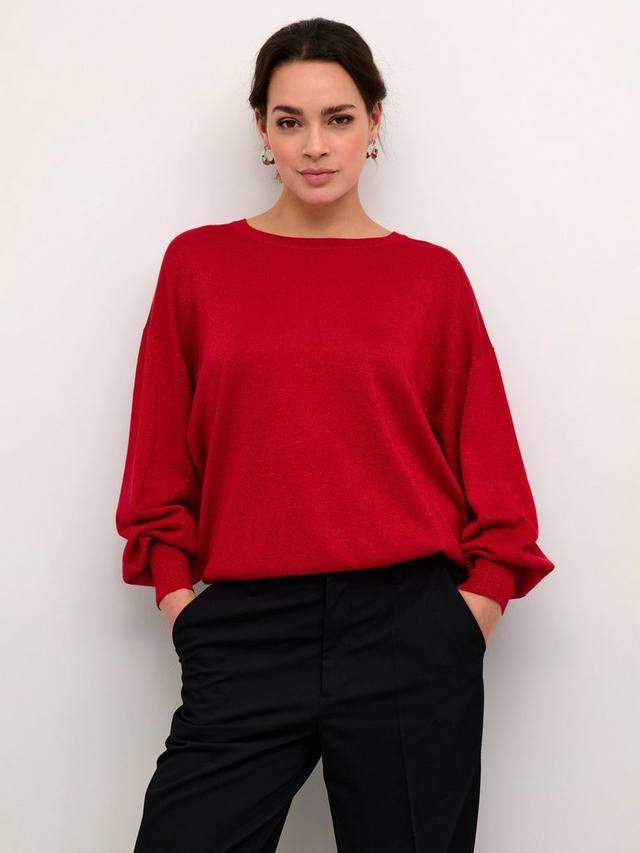 Пуловер Regina — элегантный трикотажный топ с блестящей металлизированной пряжей. Он имеет классический крой с круглым вырезом и сборкой по подолу, что придает ему мягкий объем. Рукава длинные и мягкие, собраны в широкую манжету.