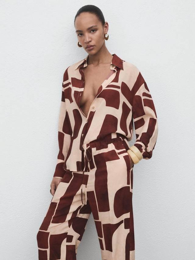 Пара брюк прямого кроя с чистой подкладкой от Mango. Они имеют среднюю посадку, застежку на молнию, геометрический принт и стандартную длину низа.