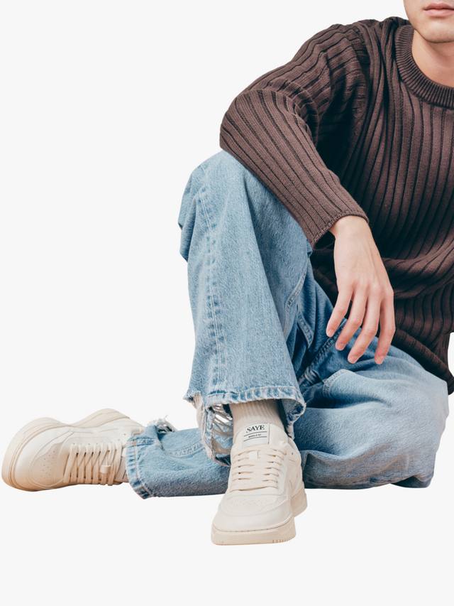 M82 Hybrid от SAYE — это повседневные кроссовки, характеризующиеся низким верхом, высокой подошвой и перекрывающимися слоями.