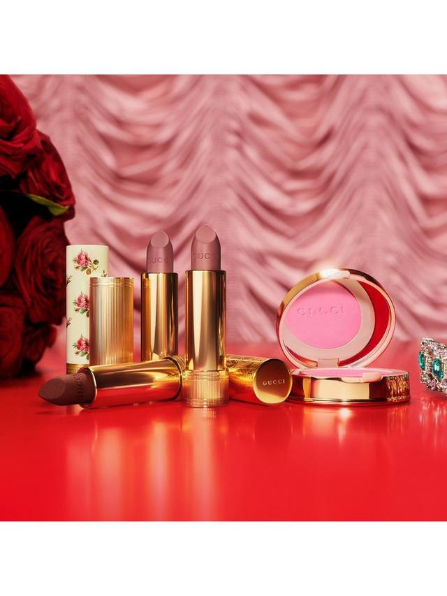 Упаковка помад, вдохновлённая винтажной косметикой, сочетает в себе фирменные мотивы Дома с современными канонами. Помада Rouge à Lèvres Voile Sheer воплощает женственность благодаря принту в виде розового бутона на футляре цвета слоновой кости с золотой основой, словно сошла с туалетного столика 1940-х годов. Розы напоминают обои старого мотеля, салон красоты в Лос-Анджелесе 1950-х годов или помаду, которую можно было найти на винтажном рынке.