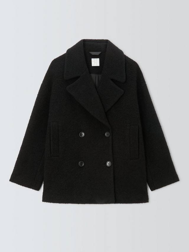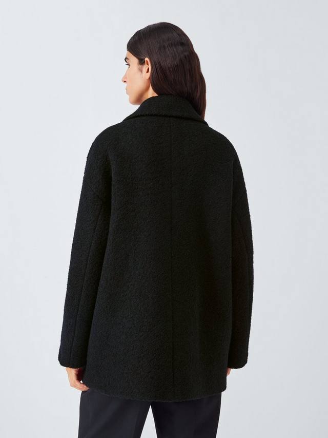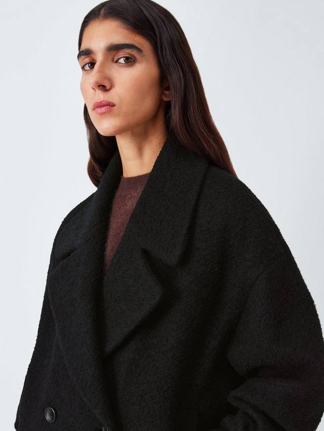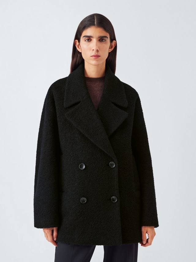 Пальто из букле с текстурой из чистой шерсти для тепла. В отделке этой двубортной модели прослеживаются нотки классического кроя: большие отложные лацканы, застёжка на пуговицы спереди и прорезные карманы с косыми краями.