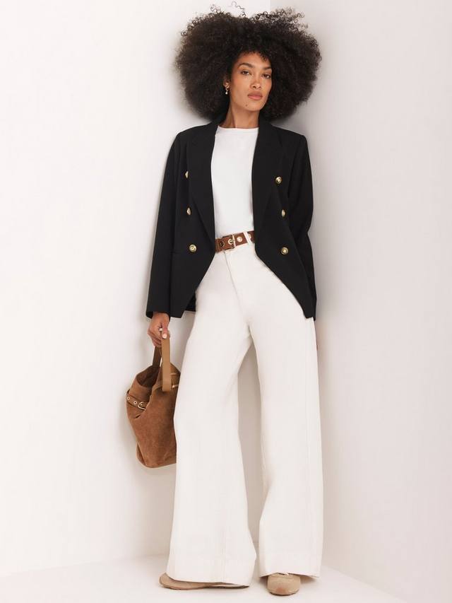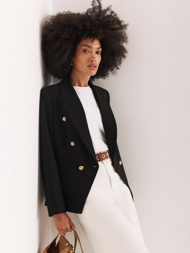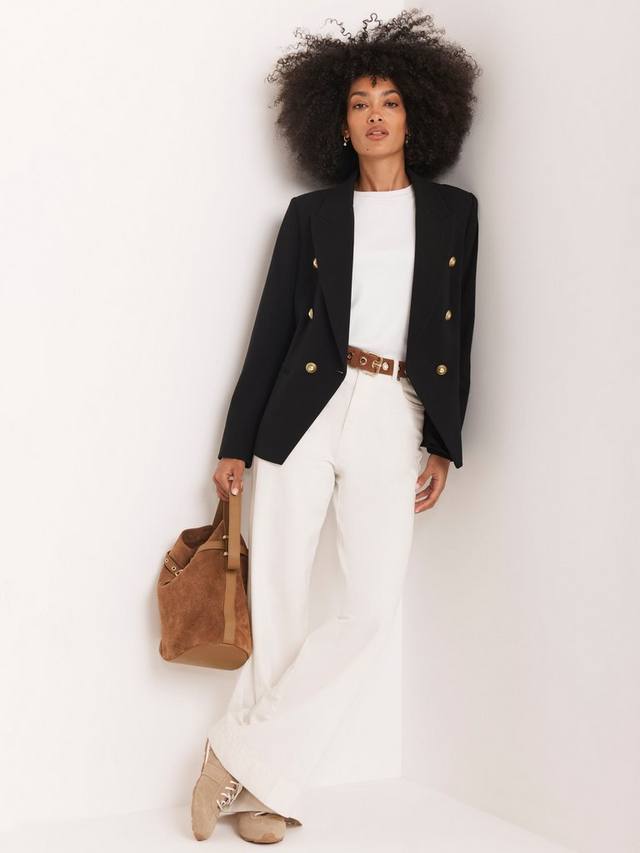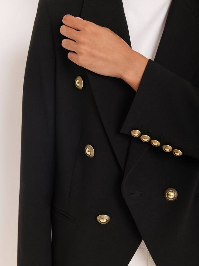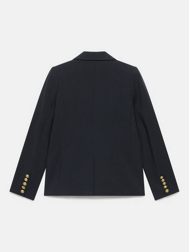 Пиджак двубортного силуэта с заостренными лацканами, длинными рукавами, застегивающимися манжетами, прорезными карманами и золотистыми пуговицами в стиле милитари, застегивающимися на одну застежку спереди. Полностью на подкладке.