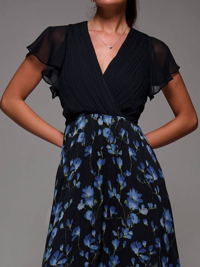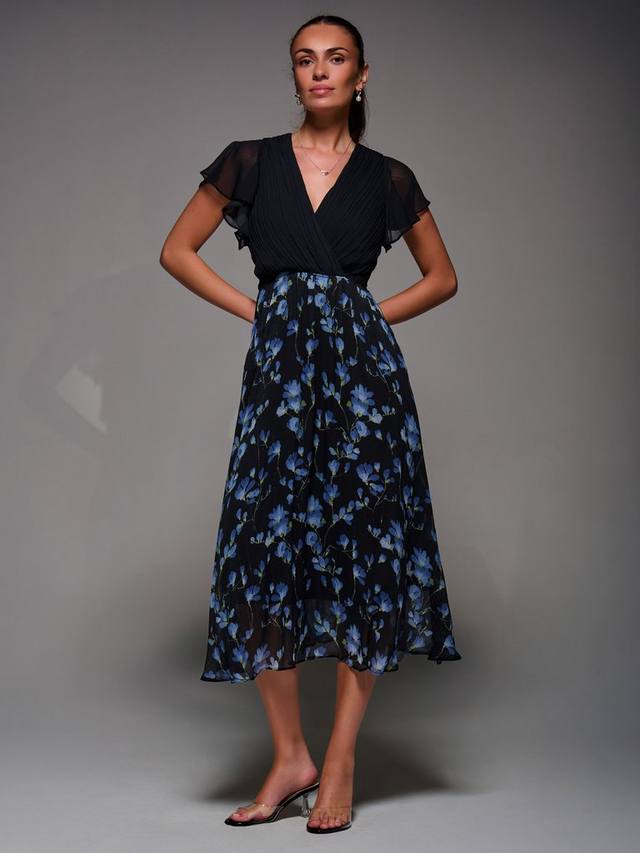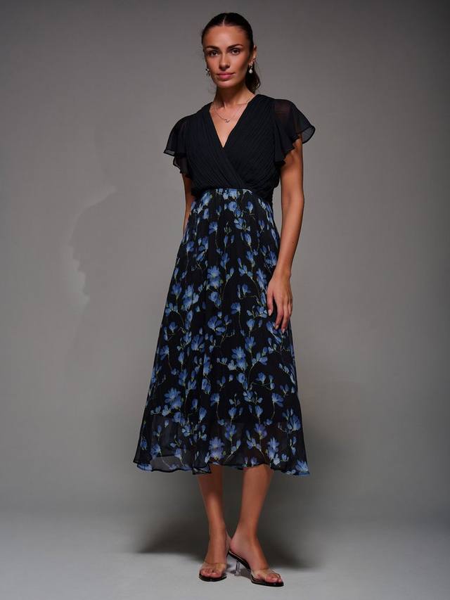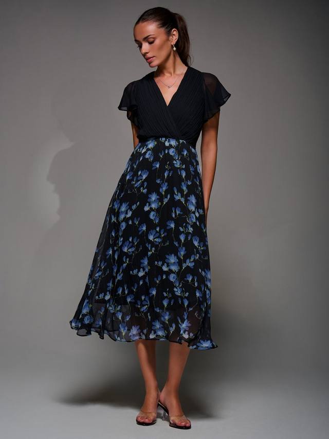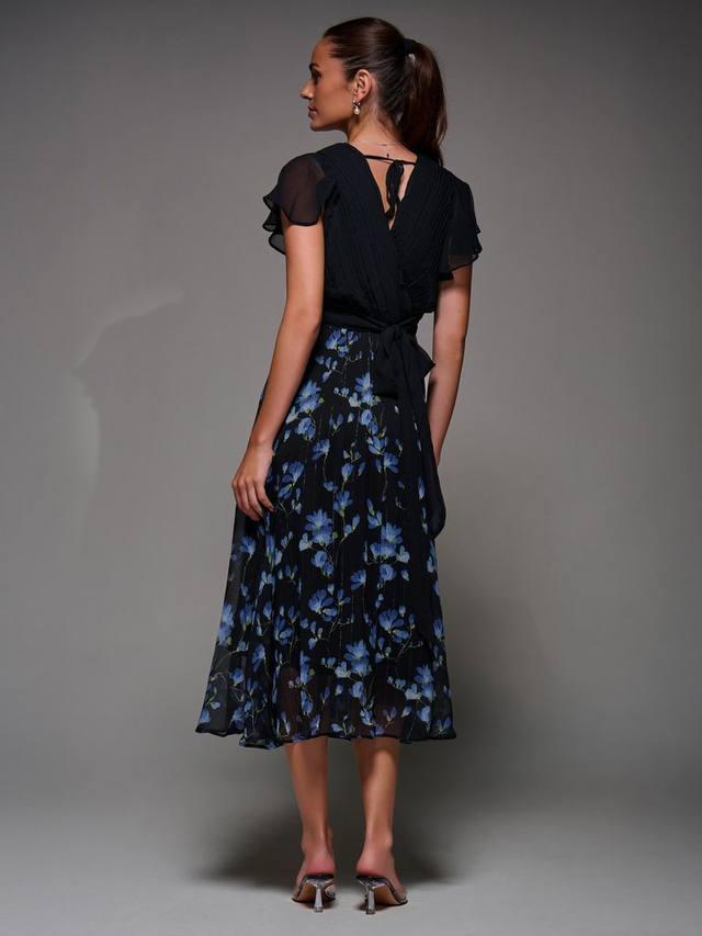 Двухцветное шифоновое платье Midaxi от Jolie Moi имеет плиссированный перед с запахом, V-образный вырез и завязку сзади. Платье имеет короткие струящиеся рукава и пояс сзади для регулируемой посадки. Платье выполнено в двух тонах, юбка украшена цветочным принтом с легкими блестками, что добавляет нотку блеска.