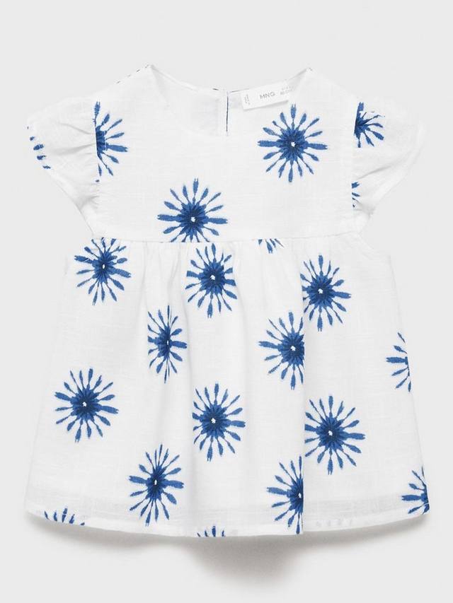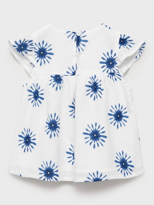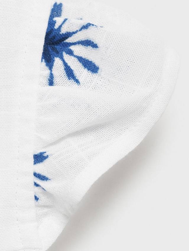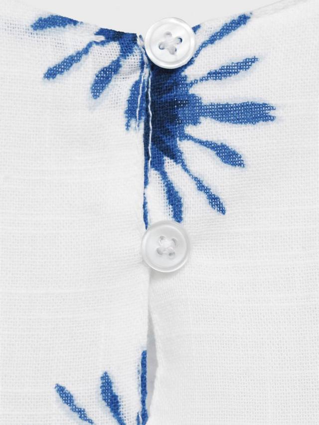 Эта блузка с принтом выполнена из 100% хлопка, имеет короткий рукав, застежку на пуговицы и плиссировку.