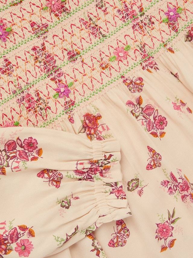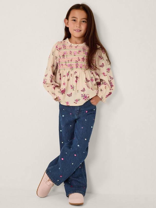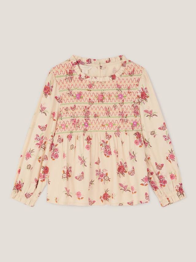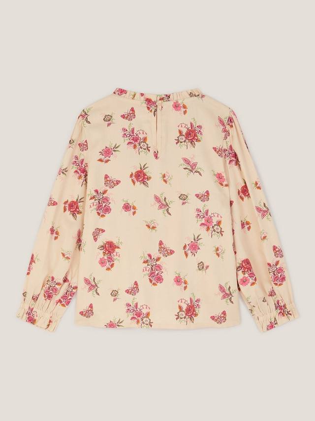 Блузка с присборенным лифом, украшенная бабочками и цветами, будет прекрасно сочетаться с любимыми шортами. Дополнена оборками на горловине и рукавах.