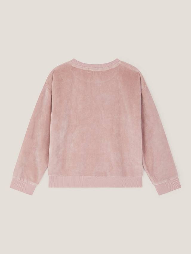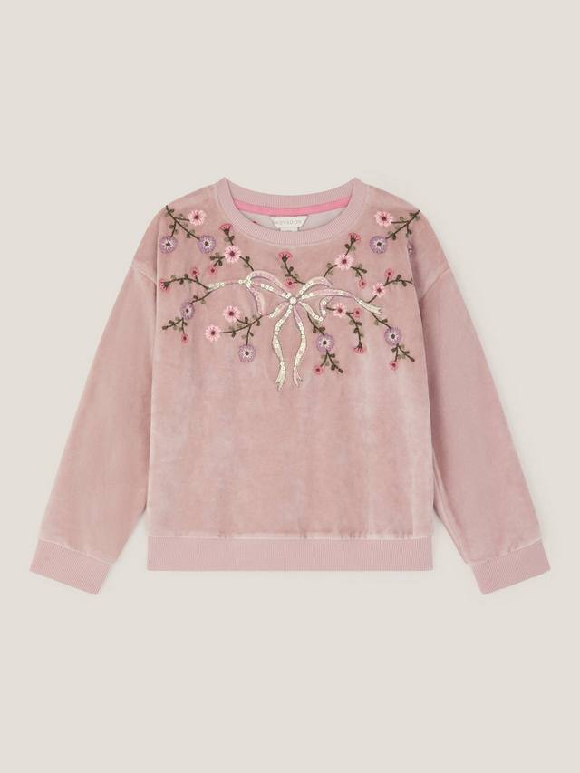 Эта толстовка из супермягкого велюра пыльно-розового цвета украшена бантом из пайеток и красочной цветочной вышивкой вокруг круглого выреза.