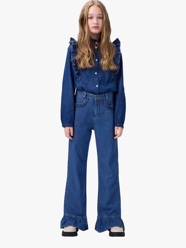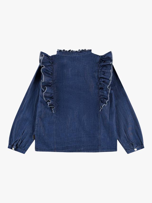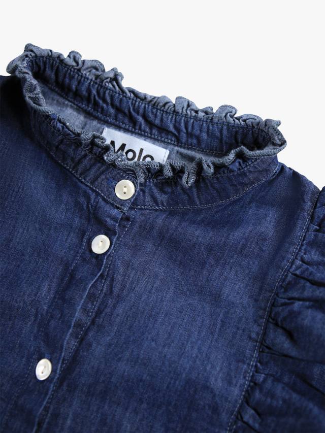 Эта джинсовая рубашка с длинными рукавами от Molo изготовлена из 100% хлопка и дополнена воротником-стойкой в виде мандарина, маленькими перламутровыми пуговицами и элегантной оборкой на плечах, которая продолжается как спереди, так и сзади. Рукава имеют небольшую манжету с разрезом и застежкой на пуговицы.