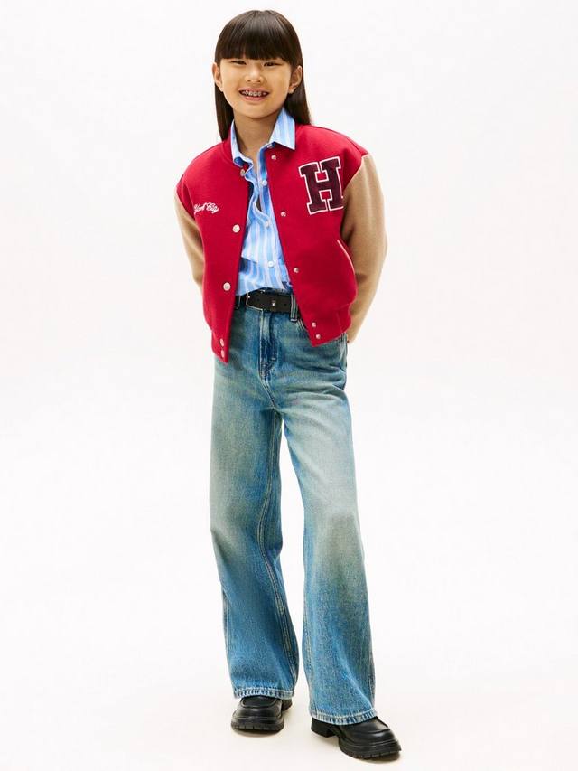Создайте классический студенческий образ с этой курткой из шерстяной саржи с ярким логотипом на спине и контрастными рукавами. Куртка имеет бейсбольный воротник, застёжку на кнопки, два передних кармана и фирменную надпись Tommy Hilfiger. Свободный крой.