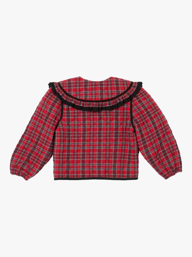 Эта стильная стеганая куртка эффектно смотрится благодаря яркой красной клетке и объемному воротнику с черной оборкой. Контрастная окантовка и удобные карманы.