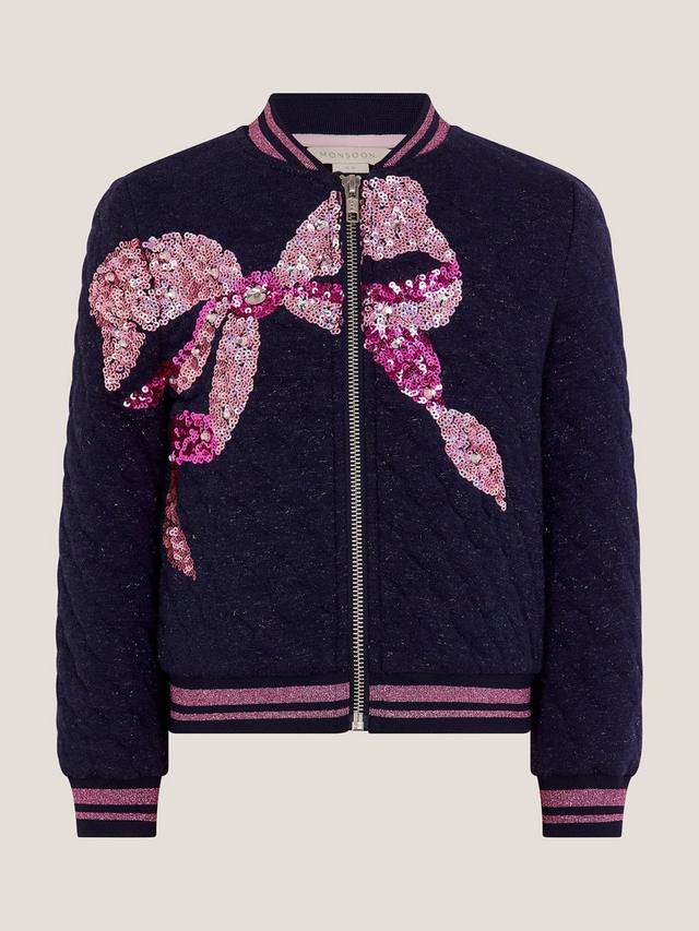 Эта куртка, выполненная в классическом стиле бомбер, украшена большим розовым бантом из пайеток спереди, который сочетается с полосками на горловине, манжетах и подоле. Застежка-молния облегчает надевание.