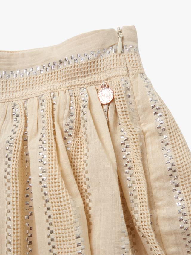 Сверкайте и блестите в этой великолепной юбке-шорте с металлическим отливом! Изготовленная из роскошной фактурной ткани в полоску нейтрального кремового цвета, она сочетает в себе практичность шорт и красоту юбки для идеального летнего образа. Одевайтесь как повседневно, но всегда оставайтесь стильной.