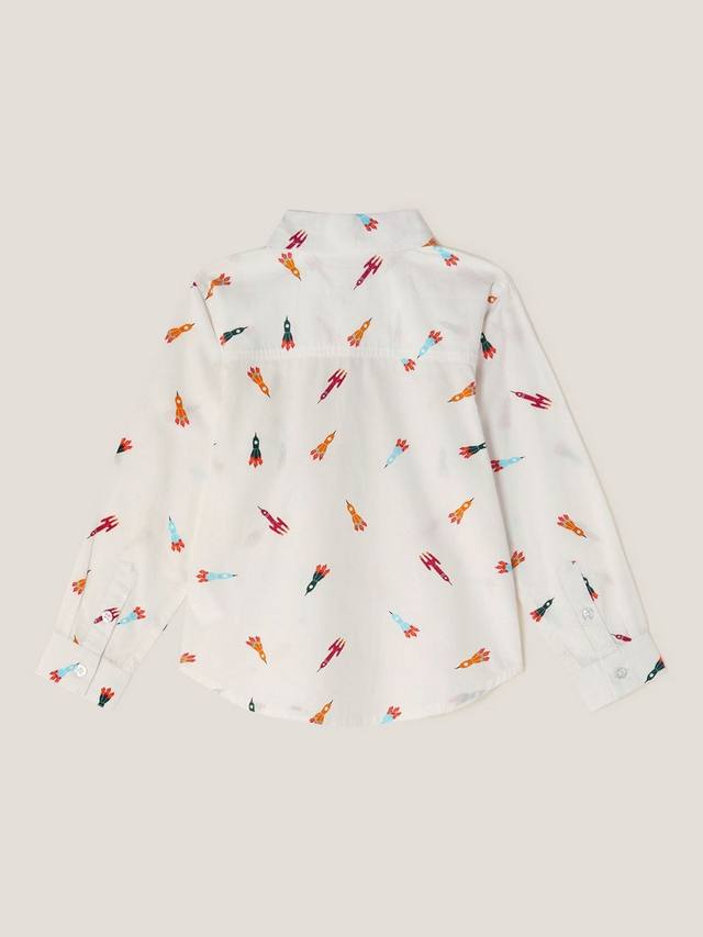 Эта рубашка из мягкого поплинового хлопка украшена рисунком ракетных кораблей в ярких цветах. Имеет классический воротник, нагрудный карман и застёжку на пуговицы спереди.