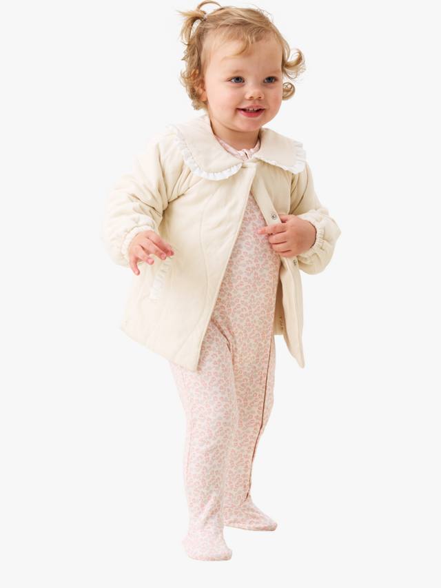 Оставайтесь в тепле и будьте очаровательны. Эта стеганая куртка из кремового джерси — идеальный слой для самых модных малышей. Благодаря эффектному воротнику-оборке и соответствующей отделке карманов, она никогда не выглядела так уютно и мило.