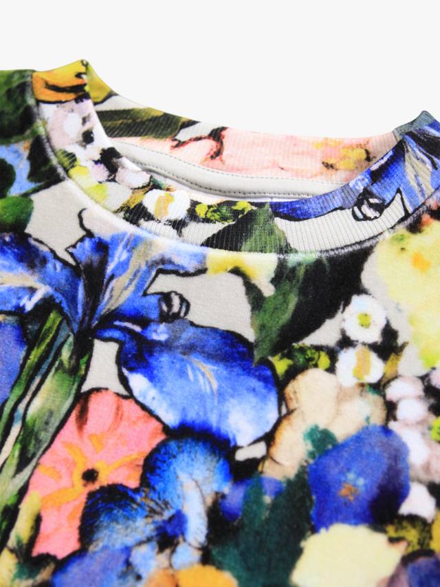 Эта разноцветная толстовка выполнена из мягкого хлопкового велюра с цветочным принтом. У толстовки круглый вырез, ребристые края на рукавах, горловине и талии, свободный крой.