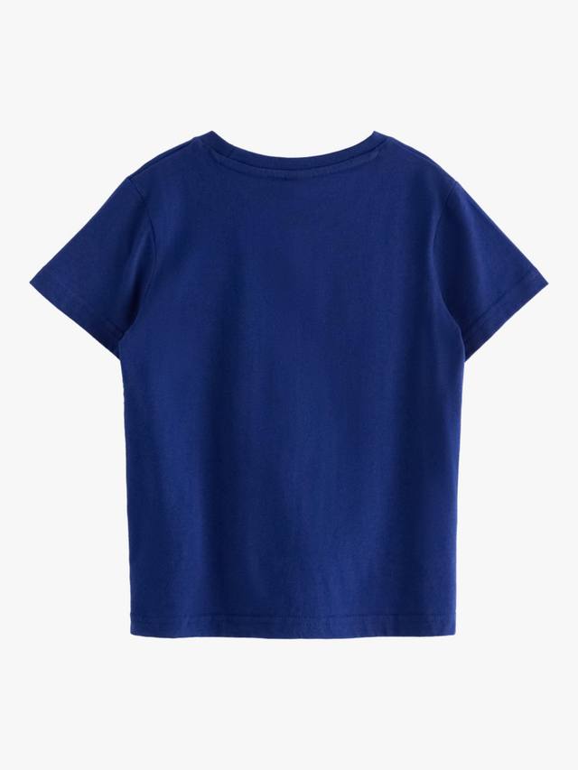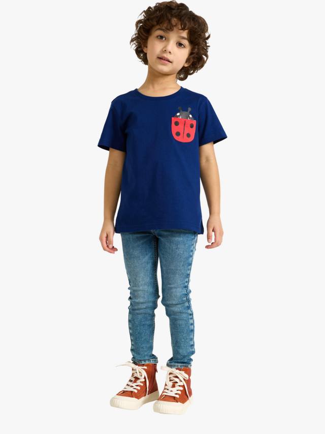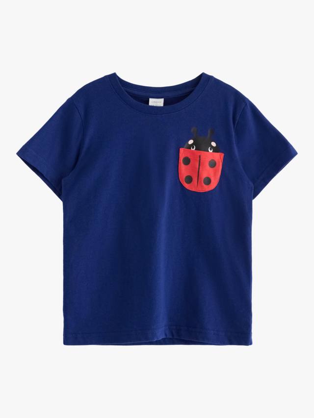 Стильная и удобная темно-синяя футболка из мягкого хлопка с очаровательным вышитым нагрудным карманом в виде божьей коровки для создания повседневного, но в то же время оригинального образа.
