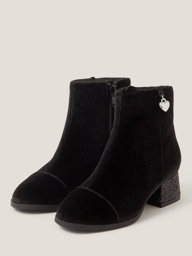 Эти ботильоны из мягкого бархата украшены блестящим блочным каблуком и подвеской в виде сердца сбоку. Застегиваются на молнию для удобства надевания.