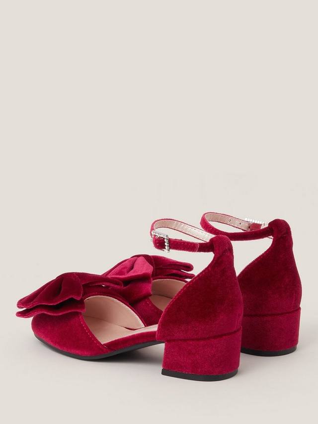 Эти великолепные туфли для особых случаев, обтянутые красным бархатом, придают им роскошный вид. Большой бант на закрытом носке и массивный низкий каблук под застежкой-пряжкой.
