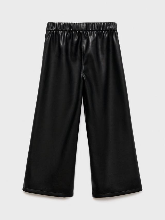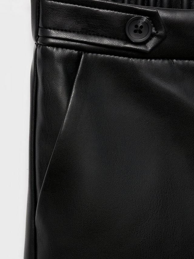 Эти брюки прямого кроя, выполненные из ткани с эффектом кожи, имеют регулируемый эластичный пояс, два боковых кармана и декоративную пуговицу.